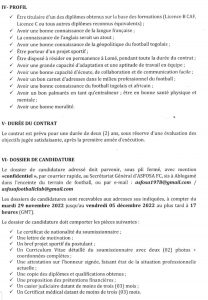 Les dossiers de candidatures doivent être adressés au secrétariat du club de la forêt Sacrée ou via l’adresse électronique du club à compter de ce mardi 29 novembre jusqu’au vendredi 5 Decembre Prochain. Le principal profil porteur d’un bon projet sportif qui cadre avec les ambitions du club sera retenu après délibération sur les trois meilleurs profils sélectionnés et signera un contrat de 2 ans à la tête du club.