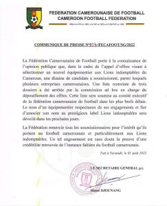« Le nom d’un nouvel équipementier respectueux de ses engagements et fier d’associer son nom au glorieux label Lions Indomptables sera dévoilé dans les prochains jours», a écrit le secrétaire général par intérim de la Fecafoot Blaise Djounang dans un communiqué.