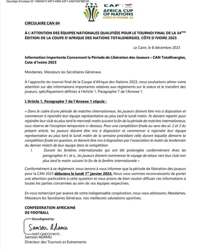 “Conformément à ce réglement, nous tenons à vous informer que la période de libération des joueurs pour la CAN 2023 débutera le lundi 1 janvier 2024, Nous vous sommes reconnaissants de porter une attention particulière à cette question et vous prions de bien vouloir diffuser ces informations à toutes les parties concernées au sein de vos équipes respectives”, indique la note signée par Samson Adamu, directeur des tournois et événements de la CAF.