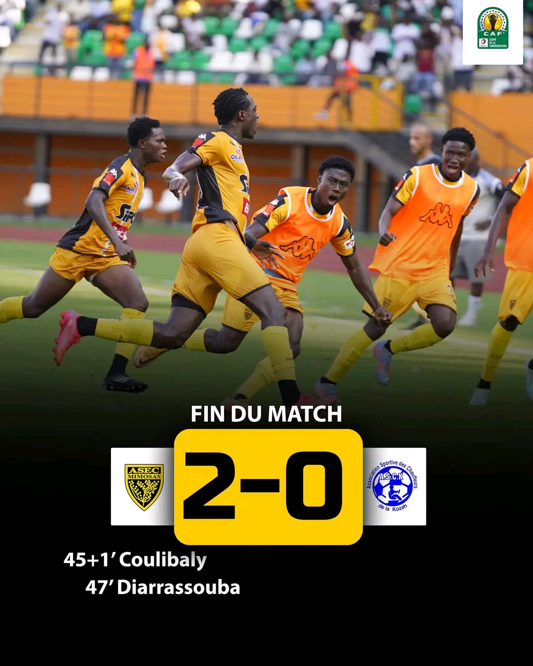 Pendant ce temps, en Côte d’Ivoire, l’ASCK s’est effondrée face à l’Asec Mimosas. Après avoir remporté le match aller avec un avantage d’un but (2-1), les Chauffeurs de la Kozah n’ont pas pu maintenir cet acquis. Ils se sont inclinés 0-2 à Abidjan, quittant ainsi la compétition sur un score cumulé de 2-3.