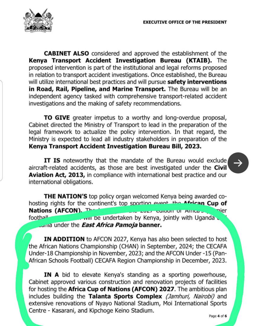 « En plus de la CAN 2027, le Kenya a également été sélectionné pour accueillir le Championnat d’Afrique des Nations (CHAN) en septembre 2024; le Championnat CECAFA des moins de 18 ans en novembre 2023 ; et le Championnat de la région CECAFA de l’AFCON des moins de 15 ans (football scolaire panafricain) en décembre 2023 », indique une note de la présidence Kényane en date de ce lundi 09 octobre.