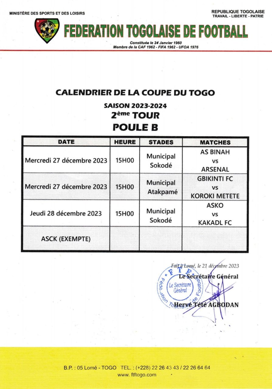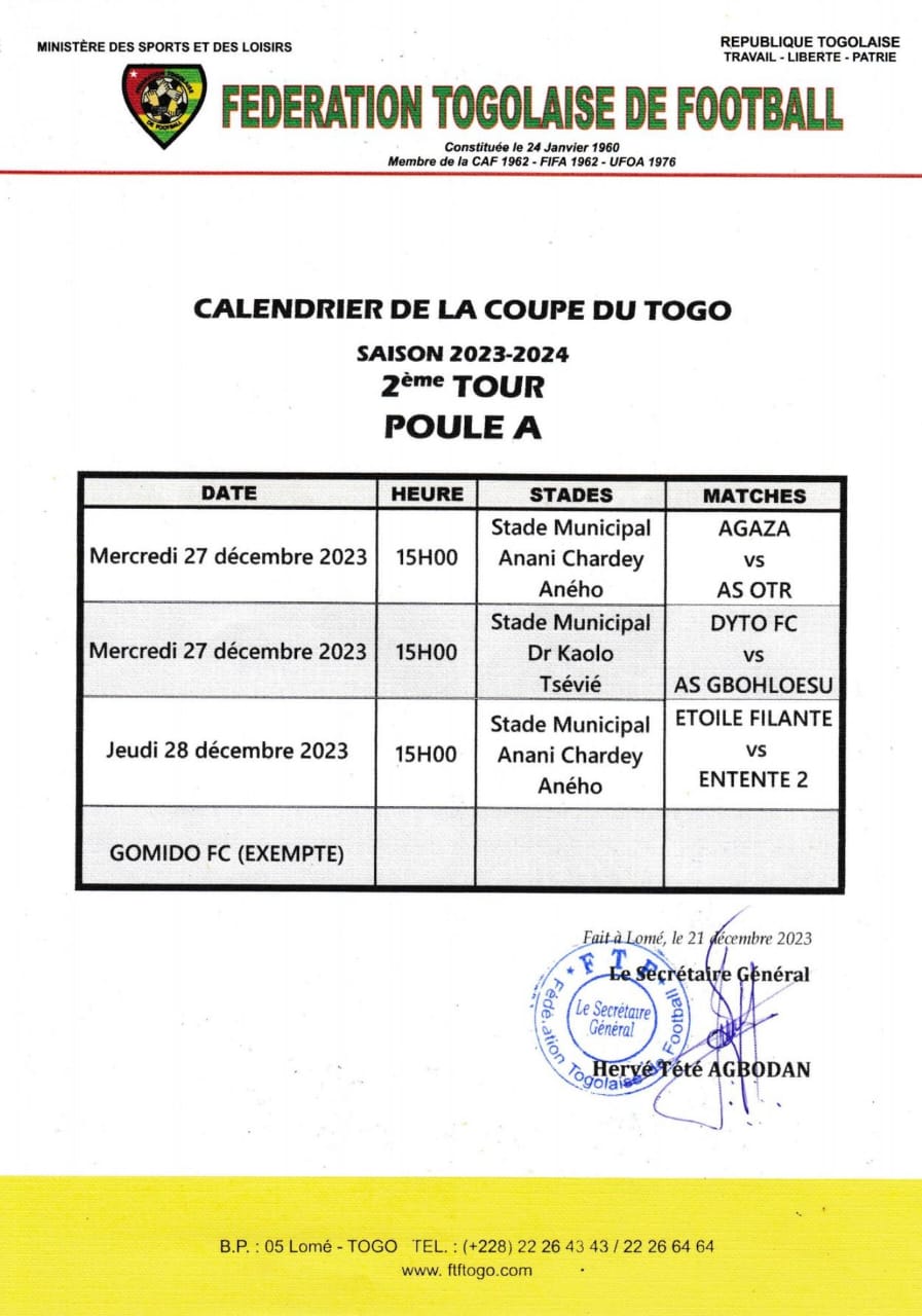 Les équipes qualifiées pour le deuxième tour de la Coupe du Togo connaissent désormais le lieu et la date des rencontres. Le Dynamique Togolais, fort de sa victoire sur Gbikinti (3-1) en championnat jeudi dernier, prendra la direction du stade Dr Kaolo de Tsévié pour y défier l’AS Gbohloe-Su, le mercredi 27 décembre. À la même heure, Agaza donne rendez-vous à l’AS OTR au stade Anani Chardey d’Aneho-kpota.
