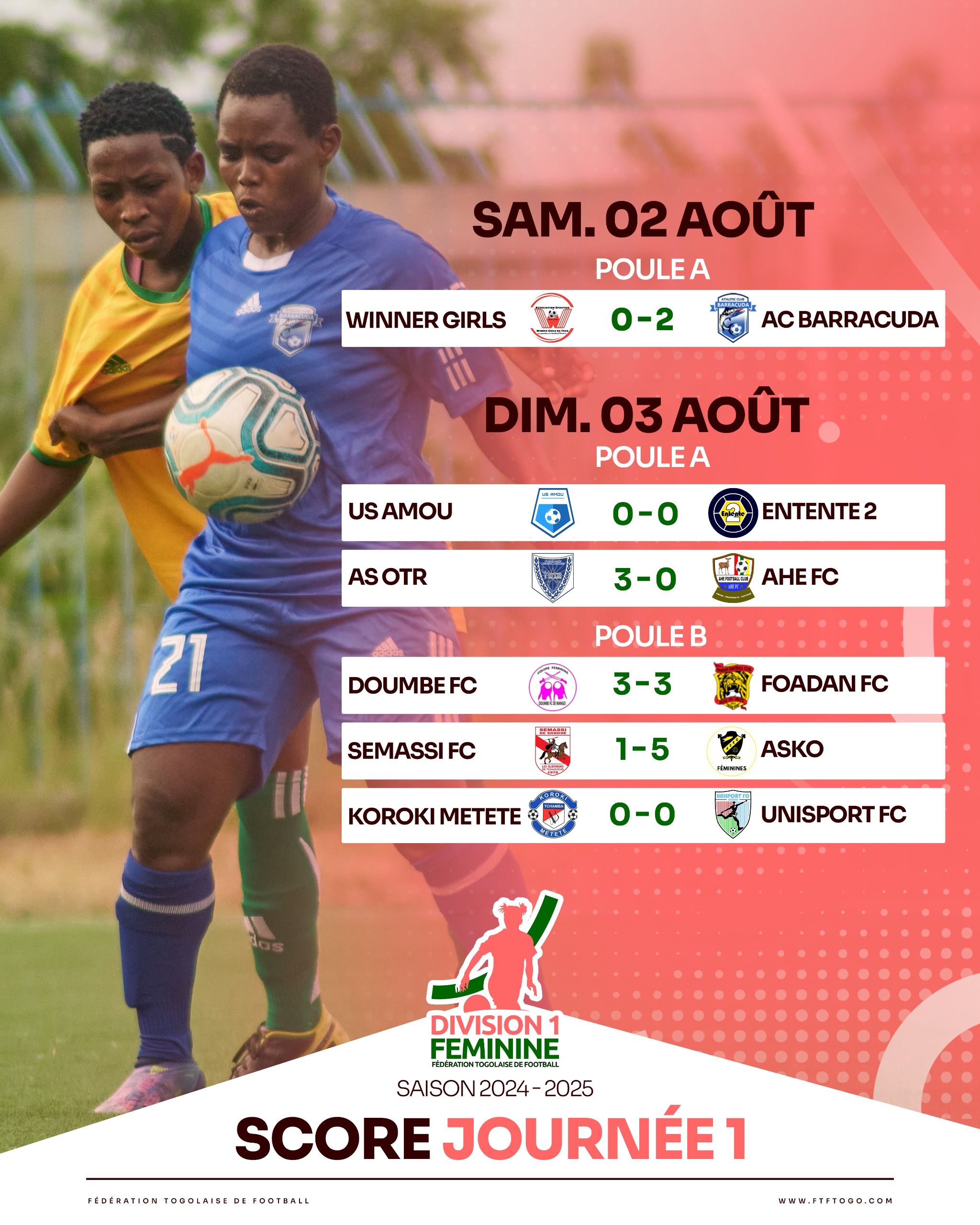 La saison 20242025 de la première division féminine togolaise a officiellement démarré le samedi 2 août. En match d’ouverture, l’AC Barracuda a parfaitement lancé sa campagne en s’imposant 2-0 sur la pelouse de Winner Girls.