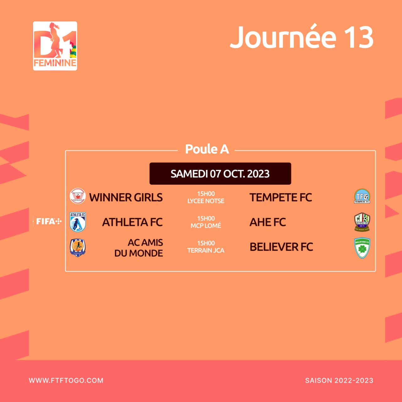 La D1 Féminine togolaise sera ses 13e et 9e chapitres respectivement dans la poule A et B ce samedi 7 octobre 2023, sur toute l’étendue du territoire national. Avant-dernière de la poule A, la formation d’Anfoin, Believer FC se déplace à Agoè pour y jouer le leader Amis du Monde.