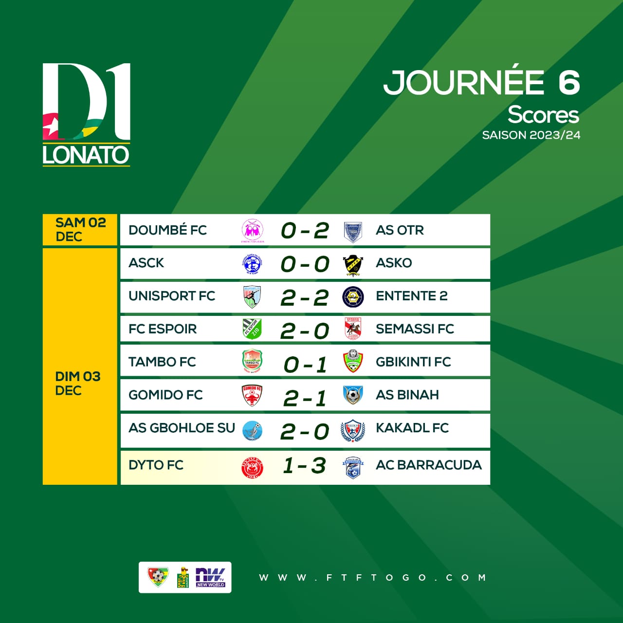 La D1 Lonato a égrené ce weekend son 6e chapitre. Les différents état-majors engagés ont connu de fortunes diverses. Renversant 2-1 face à l’AS Binah, Gomido conforte sa place de leader. À domicile, Gbohloe-Su renoue avec la victoire 2-0 face à Kakadl de Doufelgou.