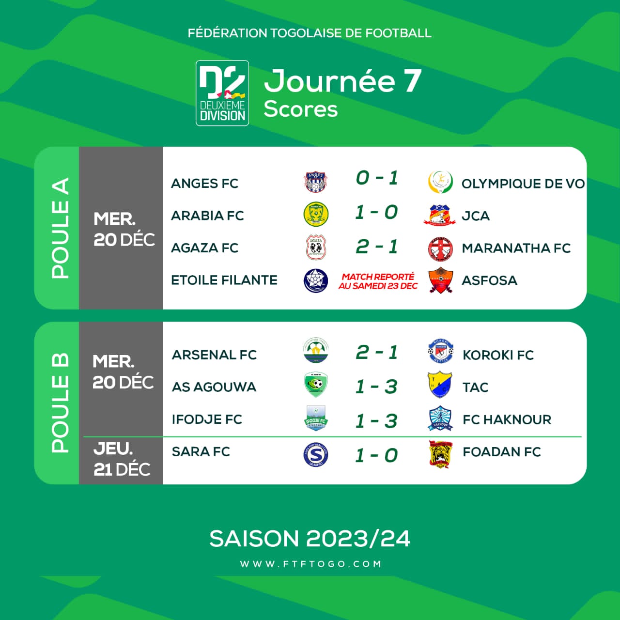 En clôture de la 7e journée de la D2 togolaise dans la poule B, Sara FC de Bafilo a dominé, 1 but à zéro, Foadan de Dapaong et renoue avec la victoire après 4 matchs sans succès. C’était ce jeudi 21 décembre au stade municipal de Kara.