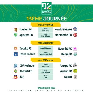 Le 13e et dernier chapitre de la phase aller de la deuxième division nationale démarre ce mardi avec deux rencontres. À Kara, Foadan mal classé (13e) offre son hospitalité au 4e Koroki Mètètè de Tchamba sous le coup de 15h00. Dans la même journée à la même heure, Agouwa FC de Koussountou reçoit les Messagers de Fiokpo.