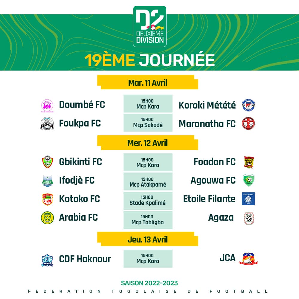 La 18e journée de la deuxième division nationale de football se déroulera du mardi 12 au jeudi 13 avril 2023. Au programme de celle-ci le public sportif de Kara aura droit au duel au sommet entre Doumbé FC de Mango et Koroki Mètètè de Tchamba, en ouverture.
