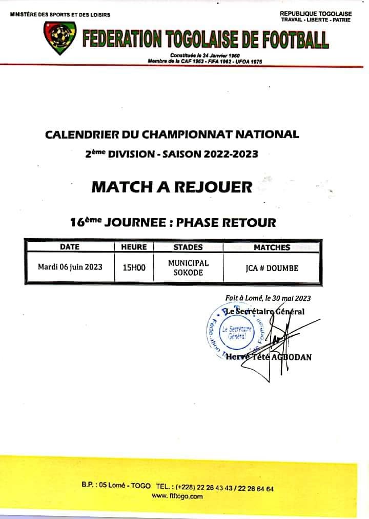 Interrompu suite à des scènes de violence, le match de la 16e journée de la D2 nationale entre la JCA et Doumbé FC de Mango sera rejoué le mardi 6 juin prochain à Sokodé.