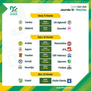 Samedi 12 février, 5 matchs seront au programme. Les Messagers de Fiokpo Maranatha FC mal en point, effectuent un déplacement périlleux à Hahotoé pour affronter Arabia FC de Tabligbo. Agaza et JCA s’affrontent dans un duel fratricide au stade municipal de Lomé tandis que Foadan acceuille CDF Haknour à Mango. Le stade municipal de Sokodé sera le champ d’explication entre l’US Koroki et Agouwa FC. Puis à Bafilo, Boundja va en découdre avec Foukpa.