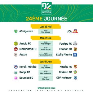 Les pensionnaires de la D2 Togolaise seront de nouveau sur les pelouses en faveur de la 24e journée du championnat. Elle s’ouvre donc ce lundi 29 Mai pour se terminer le jeudi 01 juin 2023 avec au programme, des affiches alléchantes.