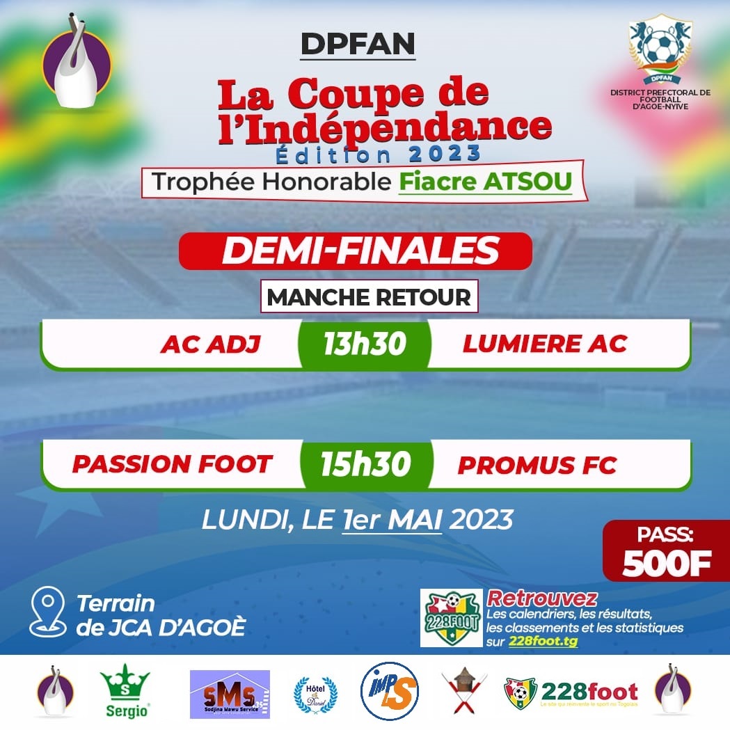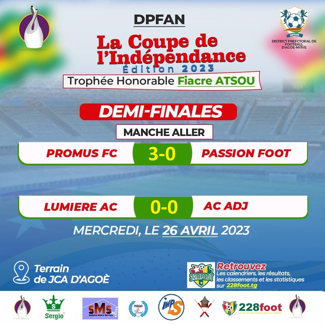La phase aller des demi-finales de la Coupe de l’Indépendance dans le District Préfectoral de Football d’Agoè-Nyivé (DPFAN) était au programme, le mercredi 26 avril, au stade de la JCA à Agoè. Promus FC bat Passion Foot et prend une option sur la qualification pour la finale.