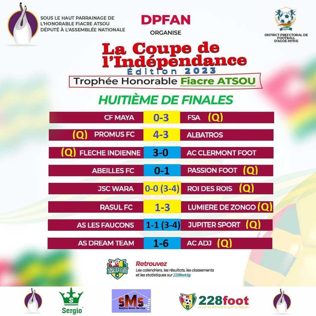 crédit photo TogoGoalLes huit équipes qualifiées pour les quarts de finale de la Coupe de l’Indépendance organisée par le DPFAN sont désormais connues. C’est à l’issue des derniers matches de huitièmes de finale disputés, ce jeudi 13 avril.