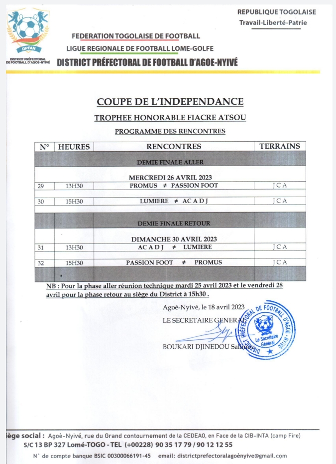 L’édition 2023 de la Coupe de l’Indépendance dans le District Préfectoral de Football d’Agoè-Nyivé (DPFAN) entre dans le dernier carré. Deux belles affiches seront au menu des demi-finales qui seront jouées en aller et retour.