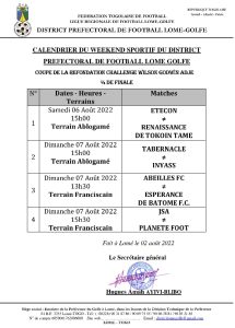 La journée de dimanche va démarrer à Adidogomé sur le terrain de Franciscain où déjà à 13h30, Abeilles FC de Sanguéra sera à la lutte avec Espérance de Batomé et à 15h30, Jeunesse Sportive d’Agbalépédo (JSA) croisera les crampons avec Planète Foot de Lomé.