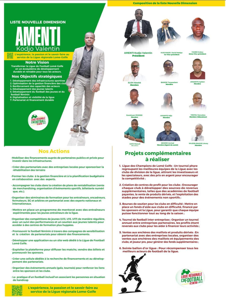 Amenti Valentin, également président du club féminin Athlèta FC et organisateur du tournoi CECAME, est une figure engagée du football togolais, notamment dans la promotion du football féminin. Sa liste propose de renforcer le développement de la Ligue en misant sur l’expertise de membres comme Kueviakue David Nabiga et Fambo Kokou, deux présidents de club passionnés, et Eloh Akouete, journaliste sportif et manager de football.