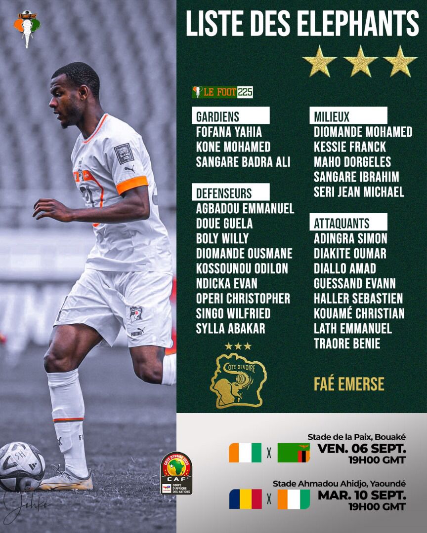 Vainqueurs de l’édition précédente de la CAN, les Éléphants de la Côte d’Ivoire remettront leur trophée en jeu au Maroc l’année prochaine. Mais bien avant, la participation à cette CAN devra passer par les éliminatoires qui s’ouvrent le 6 septembre prochain sur tout le continent. Ainsi, le tenant du titre a rendez-vous avec la Zambie le 6 septembre et le Tchad le 10 septembre 2024. Pour la circonstance, le technicien ivoirien Emerse FAE a dévoilé une liste de 25 joueurs. Si on note la présence des cadres à l’instar de Kessié, Haller, Yahia, Kossounou et autre Adingra, on note en revanche l’absence de Seko Fofana. La surprise du chef, reste le retour de Amad Diallo de Manchester United et surtout la première sélection de Mario Dorgeles et Bénie Traoré.