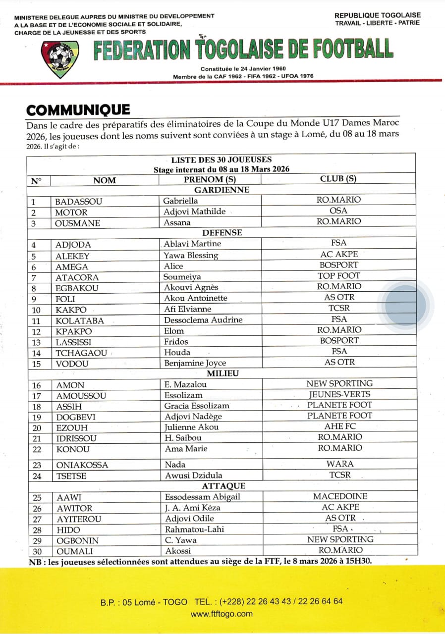 Les joueuses retenues proviennent de plusieurs centres et académies du pays, notamment RO.MARIO, OSA, FSA, AC AKPE, BOSPORT, TOP FOOT, AS OTR, TCSR, NEW SPORTING, PLANÈTE FOOT, AHE FC et WARA. Elles sont attendues le 8 mars à 15h30 au siège de la FTF pour le début du stage.