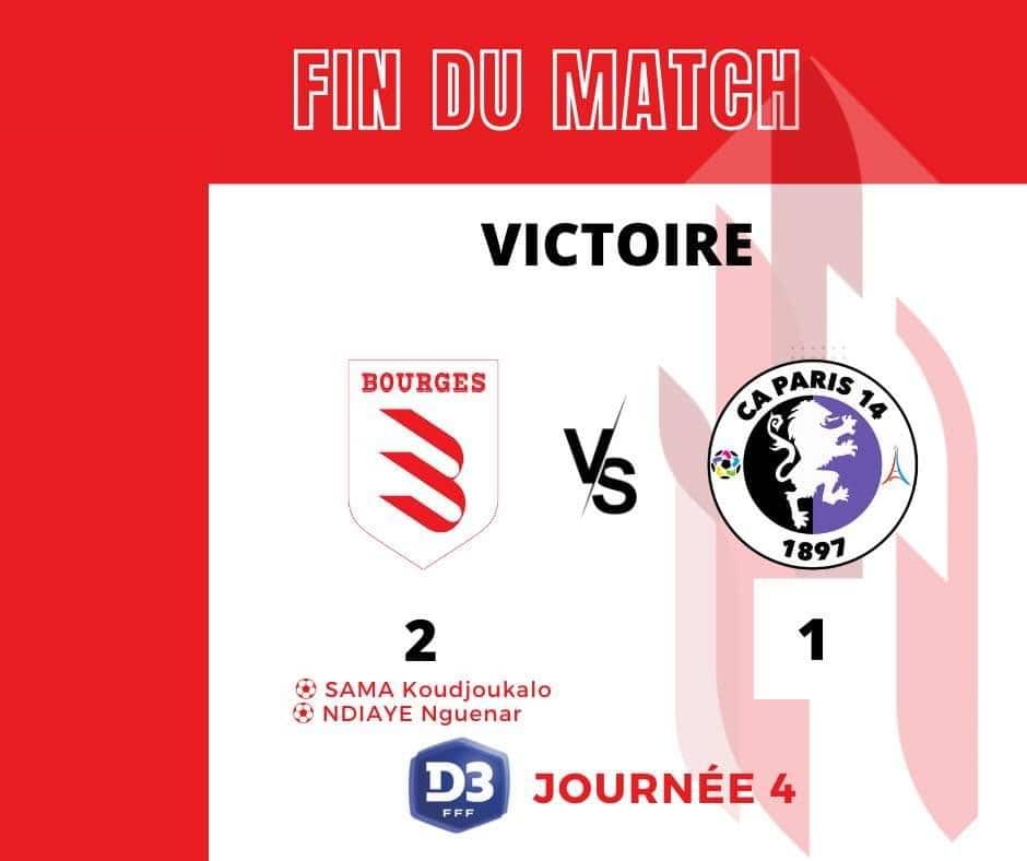 Ce dimanche, Bourges Foot 18 recevait au stade Jacques Rimbaul CA Paris pour le compte de la 4e journée de la D3 Féminine française. Six minutes de jeu seulement ont suffi à la joueuse togolaise Sama Koudjoukalo pour ouvrir la marque. Avant la pause, sa formation concède l’égalisation. À onze minutes de la fin du temps réglementaire, Ndiaye Nguemar offre finalement la victoire (2-1) aux siennes.