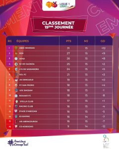 Diverses fortunes pour les clubs de la ligue 1 ivoirienne au terme de la 15ème journée, Le Fc San Pedro continue sa remontée au classement après une nouvelle victoire sur le RCA sur le score de 2-0. Le match nul entre l’ASEC Mimosas et le CO Korhogo ne change en rien sa position actuelle au classement. Les hommes du coach Julien Chevalier restent solide leader. Le Promu As Denguele n’arrive plus à suivre le rythme du début de saison, les contre-performances ont envoyé le club au 7ème rang du classement. Les limanes du fc Lys Sassandra après un match nul de plus se retrouvent à la 5ème place après le SC Gagnoa qui a battu l’Asi D’Abengourou sur le score de 2 buts à 1. Le club de l’armée SOA n’a pu faire mieux qu’un match nul de 1but partout face à l’Us Bassam. L’Es Bafing et les académiciens de l’Afad se sont aussi séparés sur un score nul de 0 but partout. Résultat nul de 1 but partout également entre Stade d’Abidjan et Sol fc.