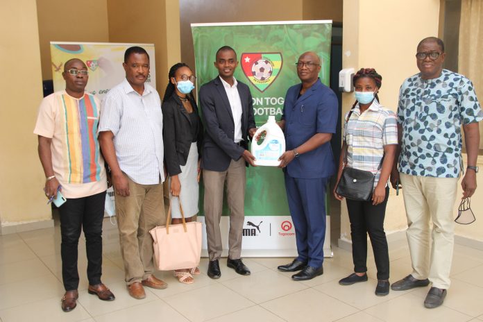 La lutte contre la pandémie de la Covid 19 reste toujours une préoccupation à la Fédération Togolaise de Football. L’agence Afrique Pub a offerte 1000 litres de gel hydroalcoolique à la Fédération Togolaise de Football. Le don a été reçu par le président de la FTF Le colonel Akpovy et quelques chefs de départements en fin de semaine dernière au siège de l’institution à Lomé. Le colonel Akpovy a salué l’initiative avant de rappeler la nécessité du respect scrupuleux des mesures barrières contre la Covid 19. Une information relayée sur le site officiel de l’instance faîtière du football national.