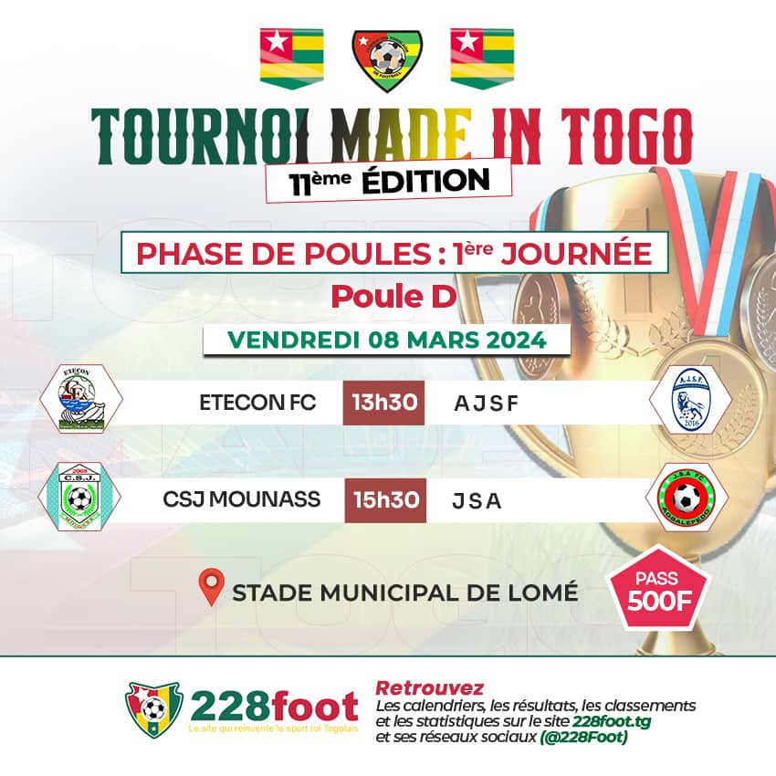 Vendredi 8 mars, la poule D sera à l’honneur. Le centre Étecon affrontera AJSF à partir de 13h30, suivi du duel très attendu entre le CSJ Mounass d’Agoè et JSA d’Agbalépédo. Ce match promet d’être passionnant.