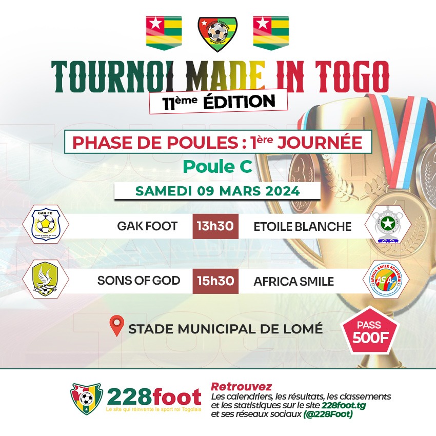 La première journée de la phase de groupes du tournoi des académies “Made in Togo” se poursuit avec l’entrée en lice des poules C et D ce weekend. Quatre belles affiches sont au programme vendredi 8 et samedi 9 mars, dont un intéressant CSJ Mounass – JSA dans le groupe D.