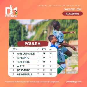 D’après la programmation officialisée par la Fédération togolaise de football (FTF) en début de semaine, la zone sud affiche une équipe de Believer FC à l’épreuve du leader de poule, l’AC Amis du Monde. La rencontre se déroule sur la pelouse du stade municipal Lomé à partir de 15 heures GMT.