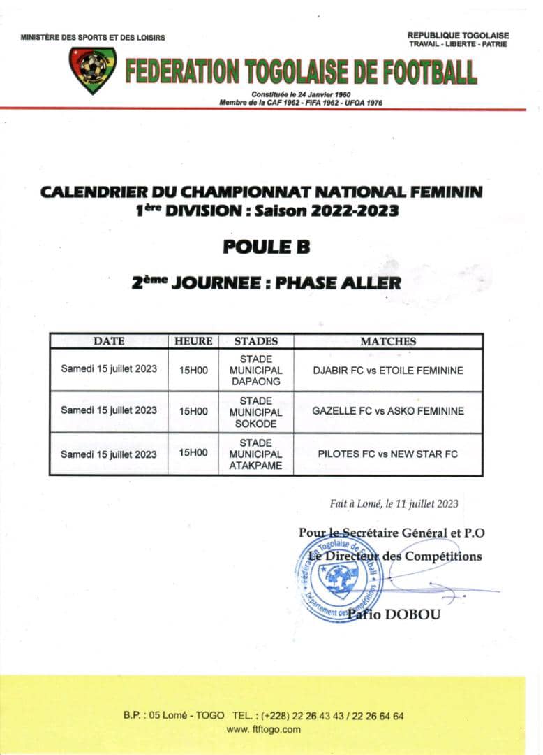 Dans la poule B, Gazelle de Sokodé tentera d’éviter une deuxième défaite d’affilée. Mais la tâche s’annonce compliquée pour les Gazelles d’autant plus que l’adversaire en face se nomme Asko Féminine. La rencontre aura lieu au stade municipal de Sokodé. Djabir FC joue l’Etoile Féminine à Dapaong tandis que le stade municipal d’Atakpamé sera le théâtre du match opposant Pilote FC de la localité à New Star venu de Tchamba.