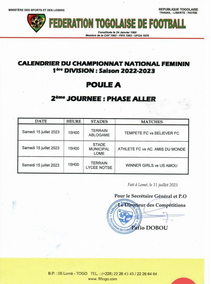 Toujours dans la poule A, Believer FC d’Afoin après un début de compétition réussi, sera en déplacement à Lomé pour y jouer Tempête FC locale. Enfin, Winners Girls et l’US Amou défaits lors de la première journée se donnent rendez-vous à Notsè.
