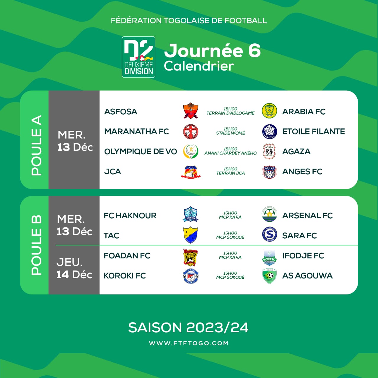 La journée se clôture le jeudi 14 décembre avec les deux derniers matchs au programme avec le club des titans entre le dauphin Foadan FC et le leader Ifofjè FC d’Atakpamé à Kara. Puis Koroki (4e) se mesurera face à la lanterne rouge Agouwa FC.
