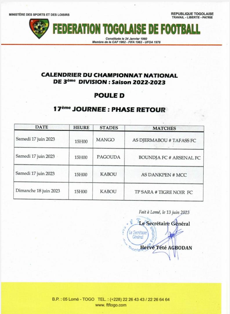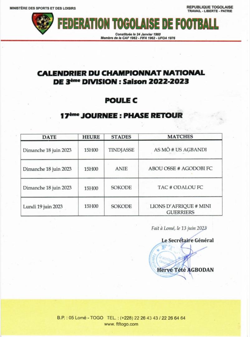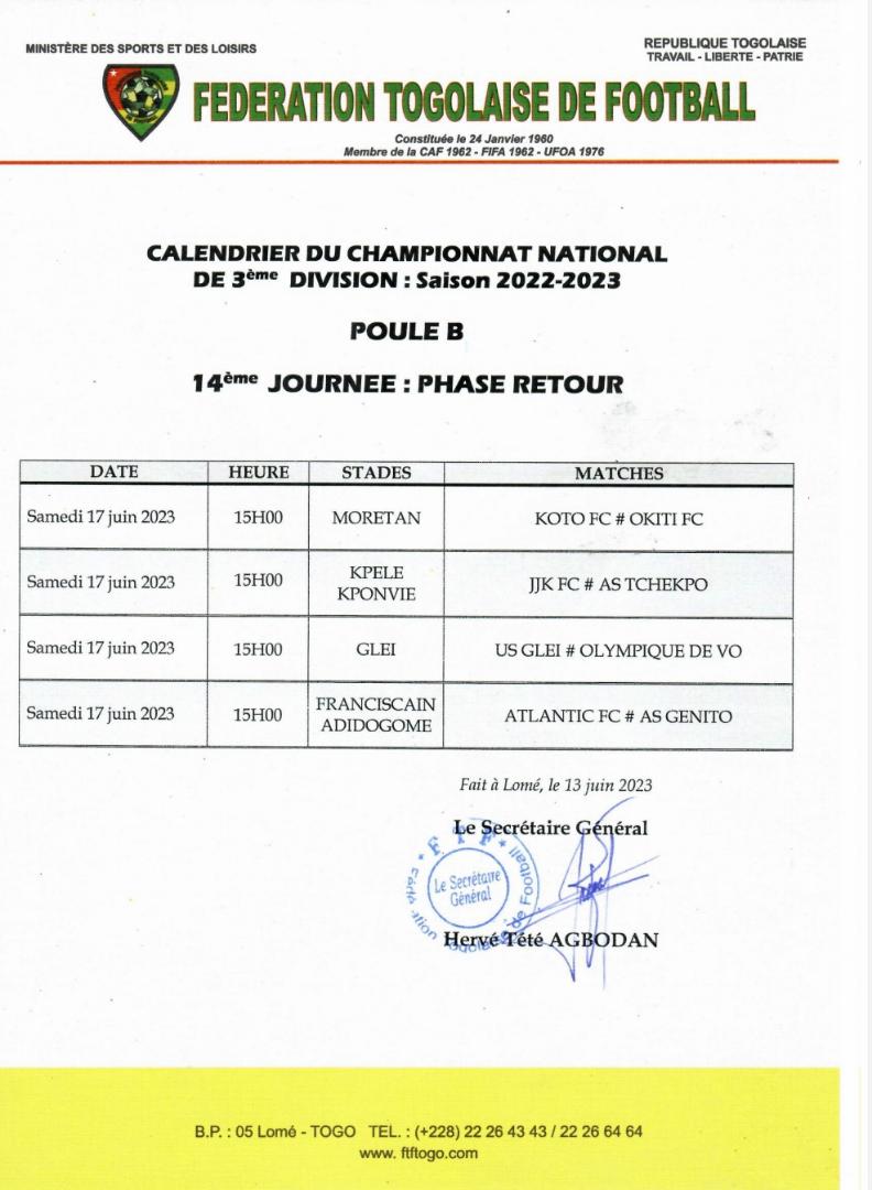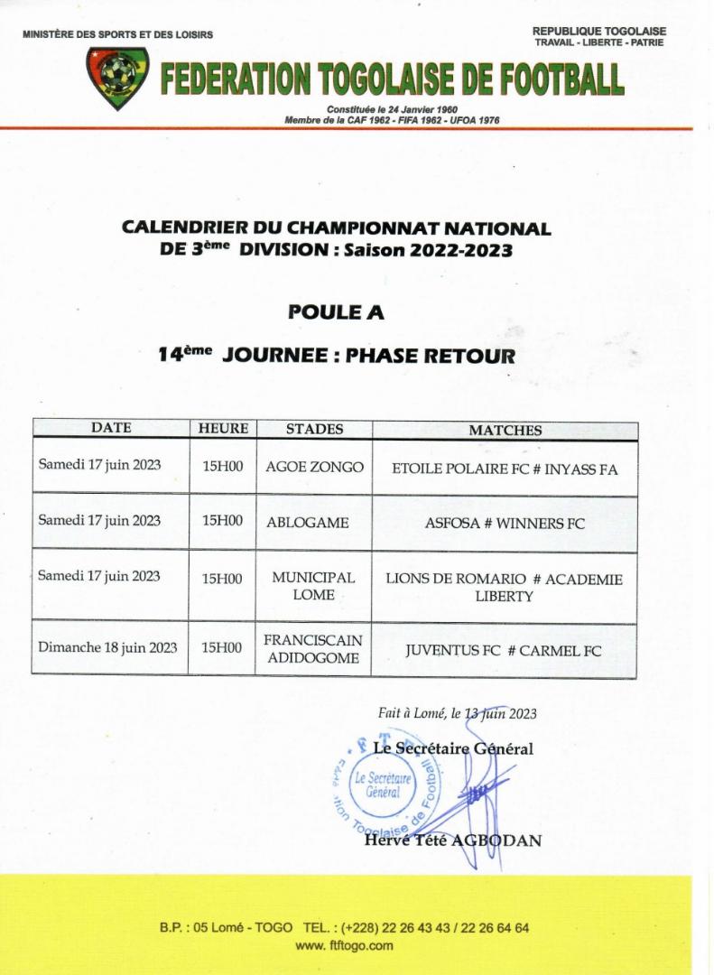 La 14e et dernière journée du championnat national de football de troisième division sera au programme le weekend du 17 au 18 juin dans la zone Sud, où l’utlime combat pour la montée en D2 attend Asfosa à Ablogamé. La 17e et avant dernière journée sera également au rendez-vous dans la zone Nord.