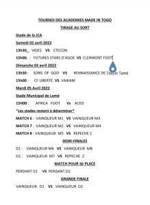 Après donc les phases à éliminatoires, la 8e édition du tournoi des académies Made in Togo aborde les huitièmes de finale dès ce samedi 02 Avril avec de chaudes empoignades. Sous le coup de 13 heures 30 au stade de la JCA, la formation de Vides FC affronte son homologue de Etecon FC. À 15 heures, le FSA croise les crampons avec Clermont Foot.