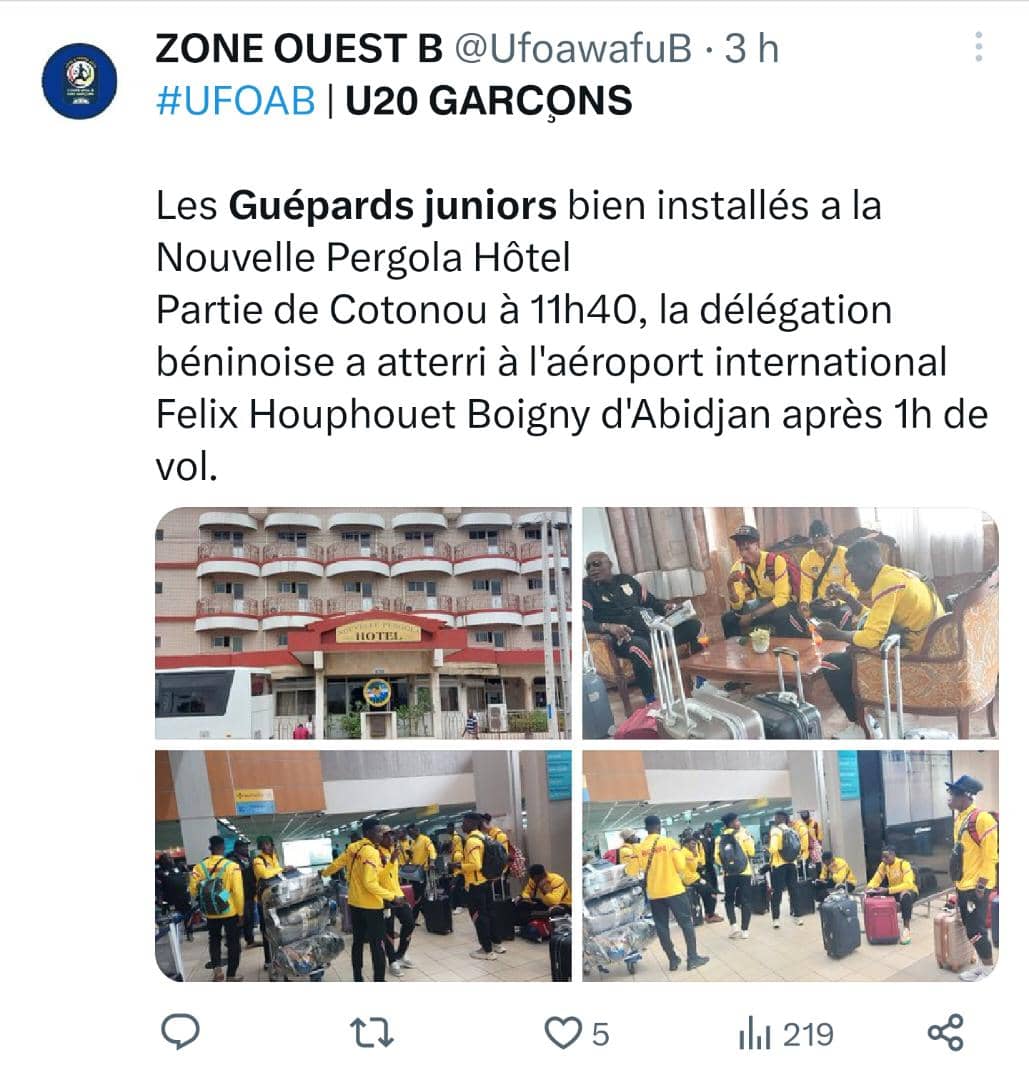 En marge de la deuxième édition de la Coupe de l’UFOA-B U20, les Guépards Juniors du Bénin sont arrivés à Abidjan où se déroule le tournoi, ce mercredi 12 juillet 2023.